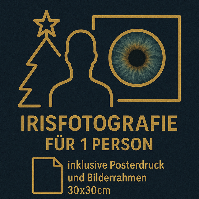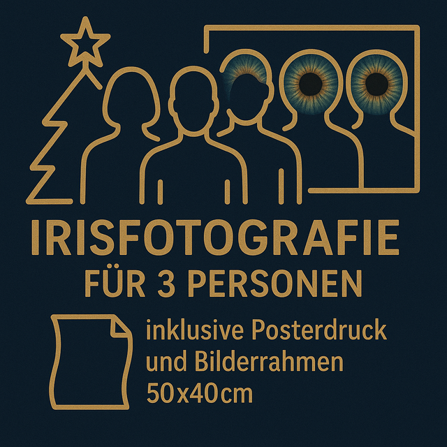 Irisfotografie inklusive hochwertigem Posterdruck und passendem Bilderrahmen (50 x 40 cm) für zwei oder drei Personen. Bei einer Person ist ein Bilderrahmen im Format 30 x 30 cm enthalten.